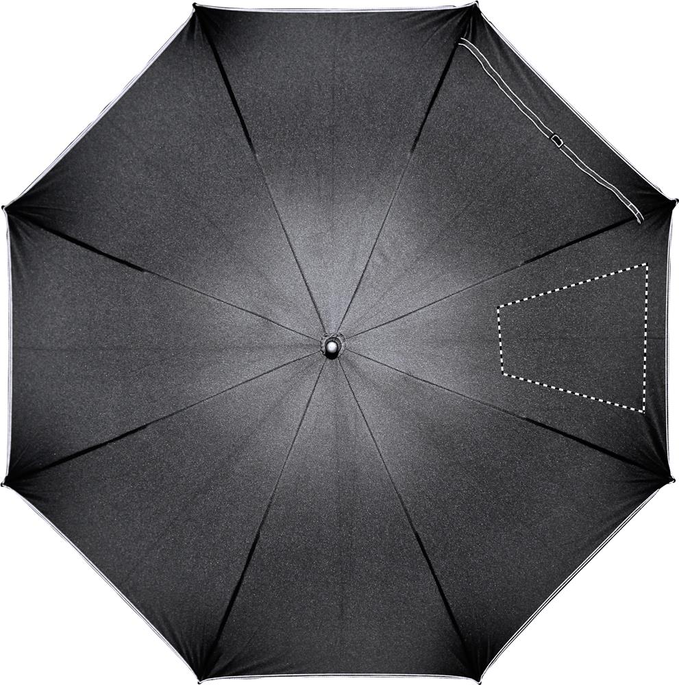 23 inch auto open windproof umbrella in 190T pongee with fiberglass shaft and ribs in colour with black plastic tips. Panels in black with matching colour stitching. Straight black plastic handle. Manual closure.