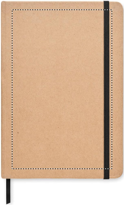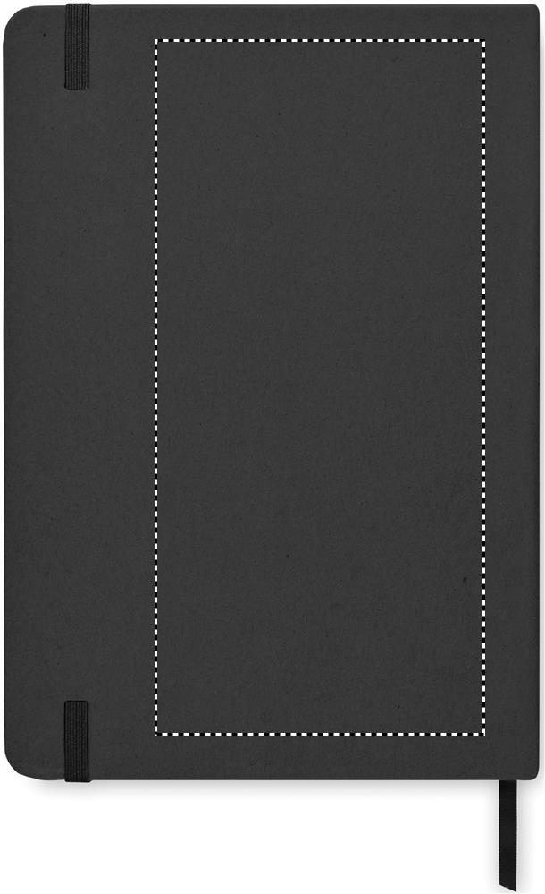 A5 notebook with hard recycled carton cover. Casebound. 160 stone paper lined pages (80 sheets). Elastic closure strap and ribbon page-marker.