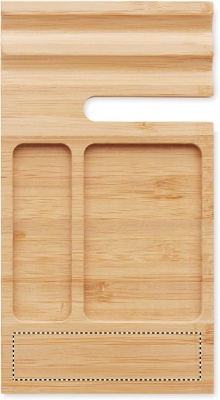 Bamboo desk phone stand with paper clips and sticky notes. Bamboo is a natural product, there may be slight variations in colour and size per item, which can affect the final decoration outcome.