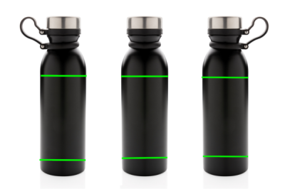 Leakproof copper vacuum insulated bottle with black silicone carry loop. One handed drinking means no need to store or carry the lid. Comes with a double-wall vacuum construction with copper insulation which means it keeps drinks hot for up to 8 hours and cold for up to 24 hours. The construction prevents condensation on the outside of the bottle. Content: 600 ml.