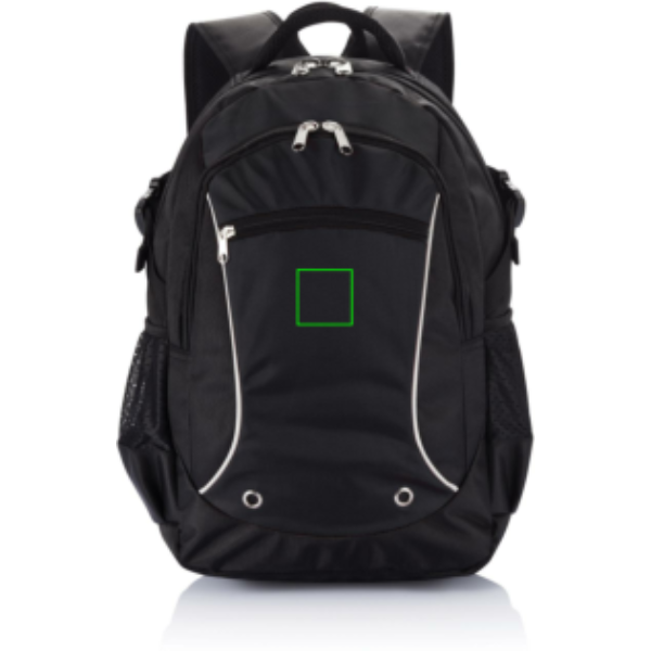 1680D and jacquard backpack. Zippered front pocket with organiser. Zippered main compartment with 15,6” padded laptop pocket. Reflective piping. Two side mesh pockets. PVC free.