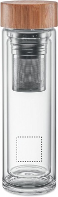Double wall in high borosilicate glass bottle and bamboo lid with tea infuser. Capacity: 400 ml. Bamboo is a natural product, there may be slight variations in colour and size per item, which can affect the final decoration outcome. Leak free. Laser engraving is not possible on borosilicate glass.
