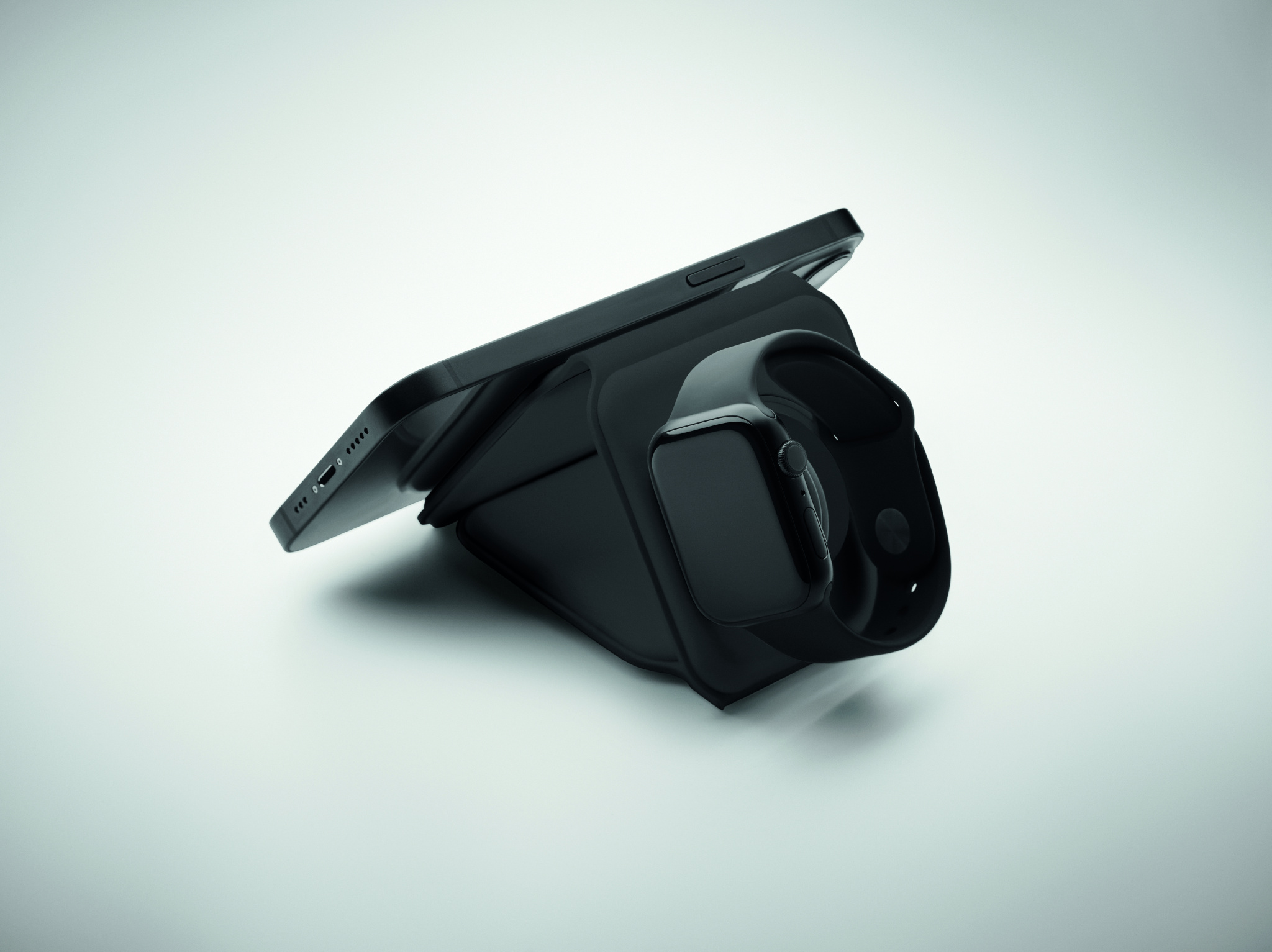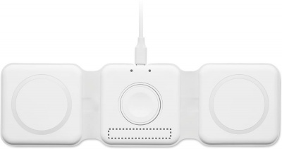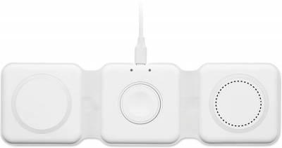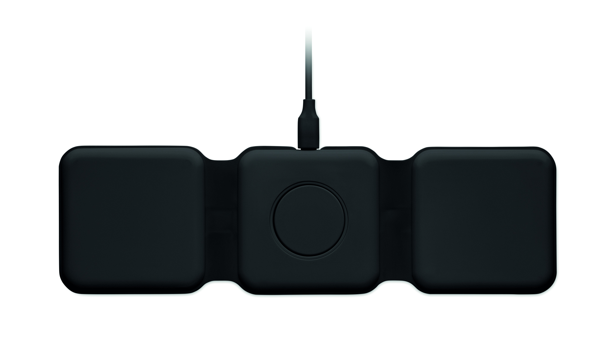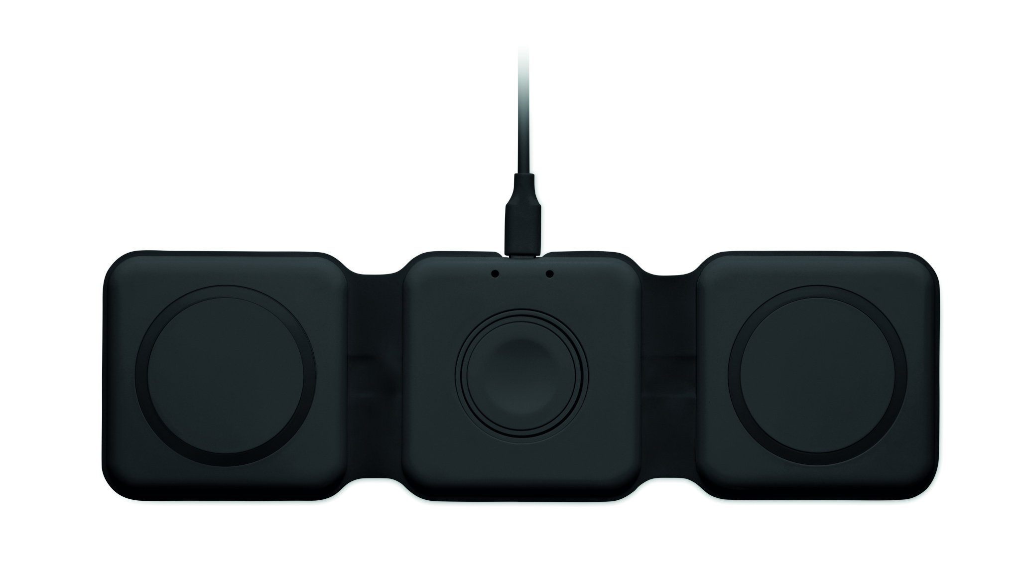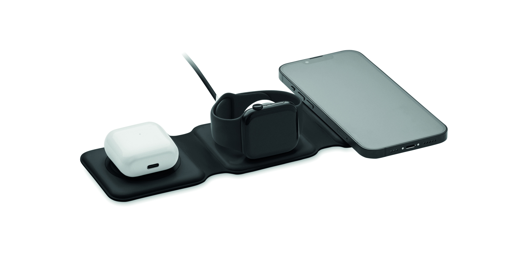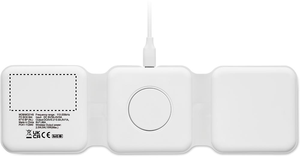 3 in 1 foldable charging station in ABS. It has 3 wireless charging spots (15W). Input: 2-in-1 Type-C and Type-A. Compatible with all QI enabled devices such as latest Androids, iPhone® 8, X and newer. Also compatible with iWatch.