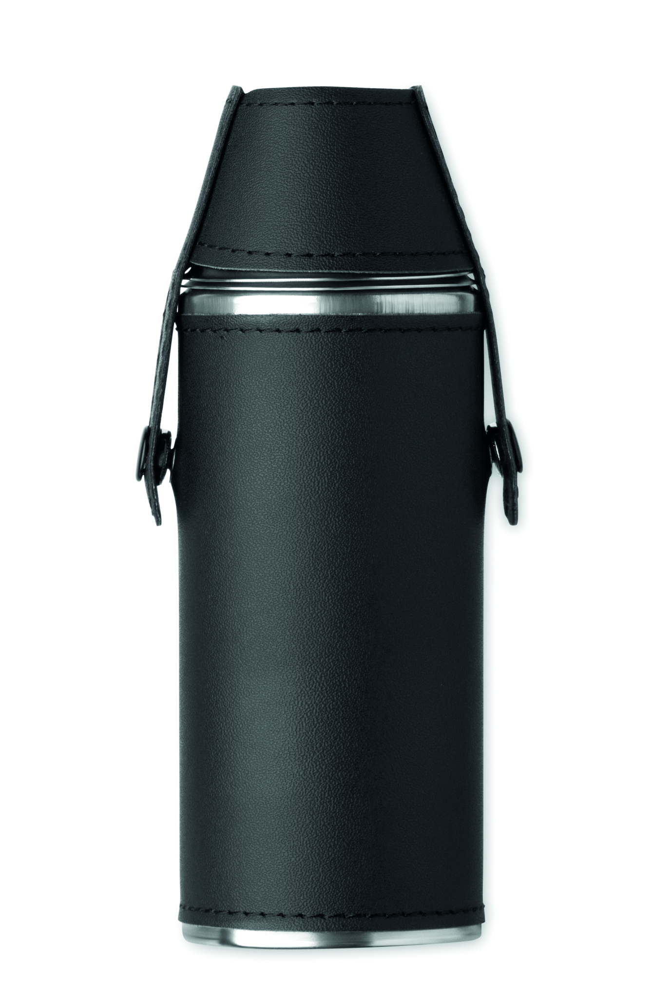 Hip Flask in stainless steel with PU Leather surface and 2 pieces stainless steel 20ml shot cups in lid. Capacity: 230ml.