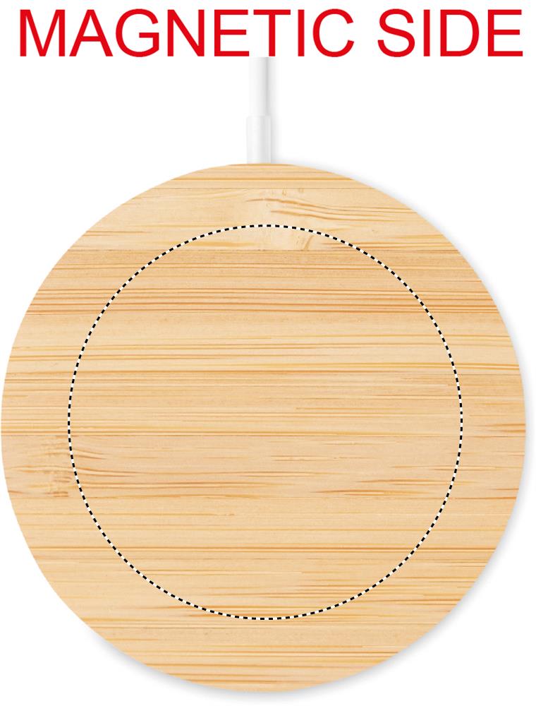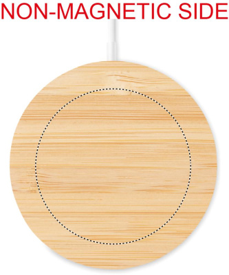 Magnetic bamboo wireless charger. Output: DC 9V/1.1A (10W) for quick charging. Compatible with iPhone® 12 and newer. Including additional magnetic metal ring to support charging of other non-magnetic wireless chargeable phones. Bamboo is a natural product, there may be slight variations in colour and size per item, which can affect the final decoration outcome.