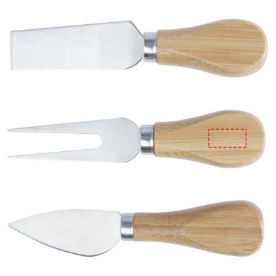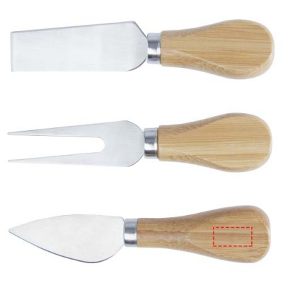 Cheese set made of bamboo with a cheese board (30 x 20.2 x 7.6 cm), 2 cheese knives (12.5 x 2.5 cm and 12.5 x 2.7 cm), and a cheese fork (13.5 x 2.4 cm). On the side of the cheese board there is a magnetic strip to attach the cheese tools, allowing you to serve cheese in style. The bamboo used is sourced and produced following sustainable standards.