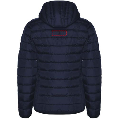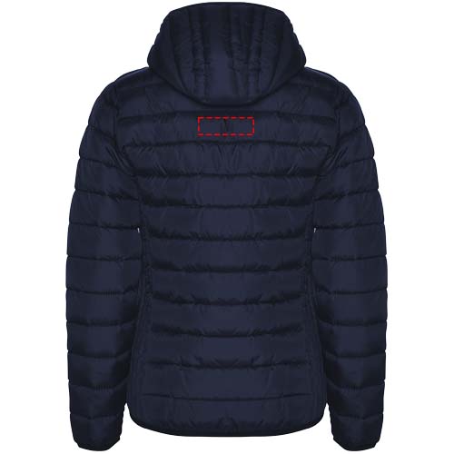 Women's feather touch quilted jacket with fitted hood. Inverted zips with matching chin protector. Two front pockets with zip. Matching elastic trim in cuffs, hem and hood. Contrasting inner lining. Stow carry bag included. Light and foldable garment. Fitted-cut. Water resistant. Wind-proof model.