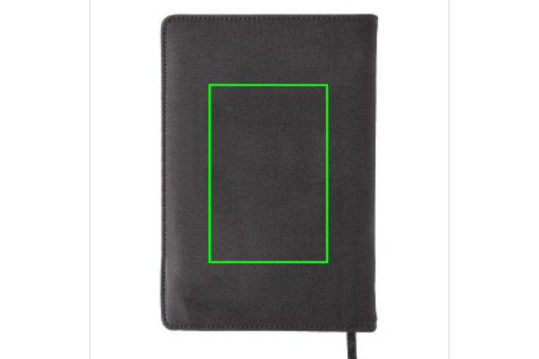 Coated PU notebook cover with a front phone pocket (14 x 10cm), pen pocket and one main pocket . Black page divider and 160 pages of 80g/m2 paper inside. This notebook cover can be re-used with new A5 notebook paper for endless writing.