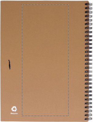 Recycled paper notebook with pen. Twin-wire. 140 plain recycled paper pages (70 sheets). Push button ball pen in recycled carton and biodegradable plastic. Blue ink. Black elastic pen holder.