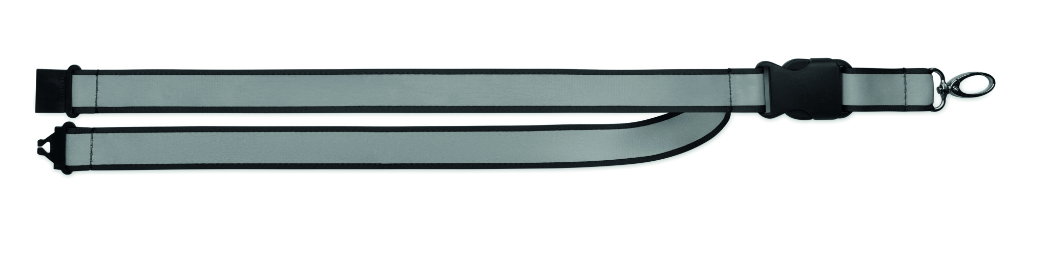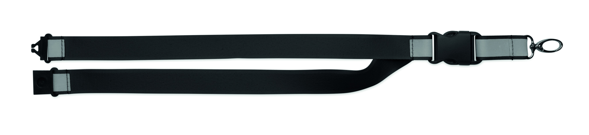 Reflective RPET polyester lanyard with 2.5 cm strap, metal hook, detachable PP buckle and safety breakaway. For promotional use only.