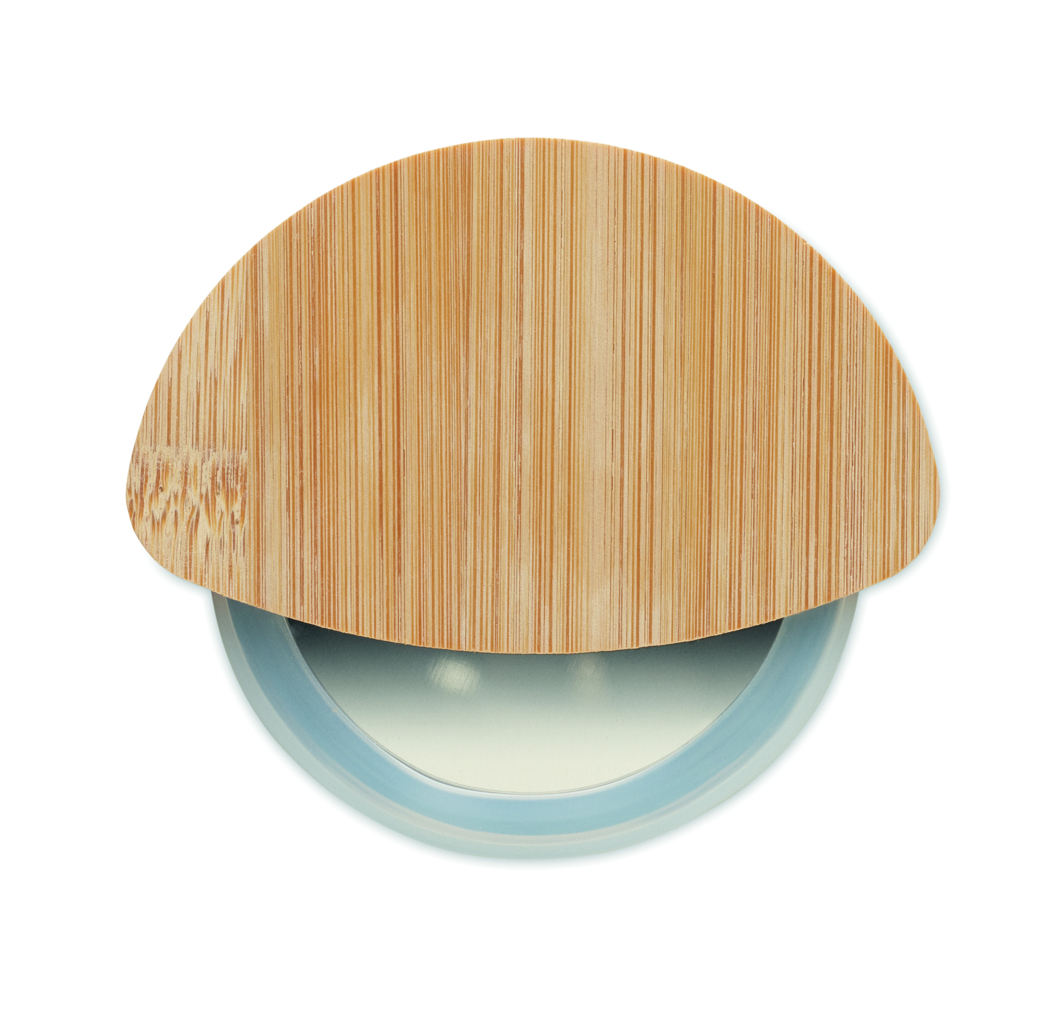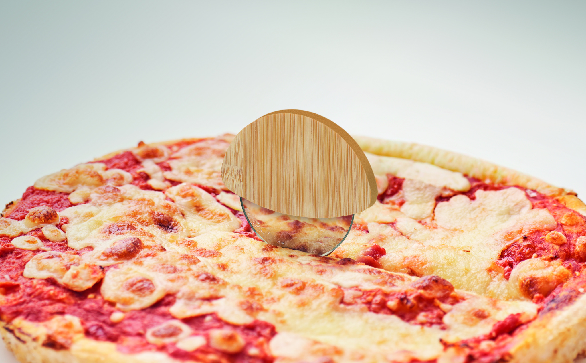 Round pizza cutter with bamboo handle and stainless steel blade. Features transparent white silicone protection ring.