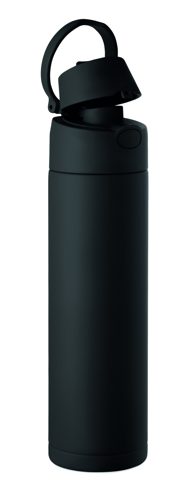 Single wall recycled stainless steel (90% recycled stainless and 10% stainless steel) bottle. Features 2-in-1 straw and sip PP lid with handle. Leak-free. Capacity: 650 ml.