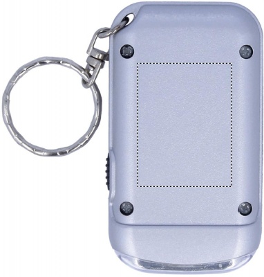 Satin silver torch keyring with 2 white LED bulbs powered by solar panel.