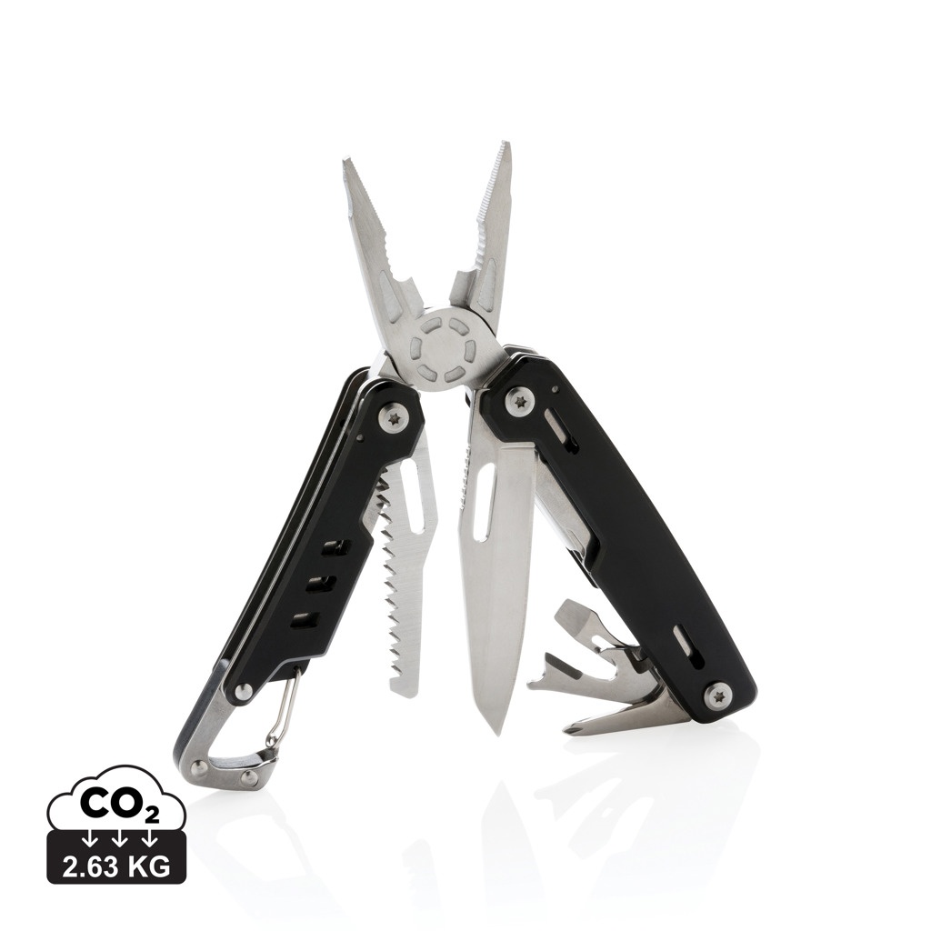 Strong and durable multitool with 11 functions. With aluminium case and stainless steel tools. Tools include: needle nose plier, regular plier, wire cutters, knife, phillips screwdriver, flat screwdriver, saw, can opener, bottle opener, wire stripper, carabiner. Packed in gift box.
