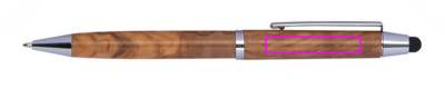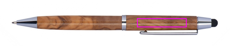 Ballpen made of olive wood, with touch function and blue writing refill. Your logo will be engraved below the clip.