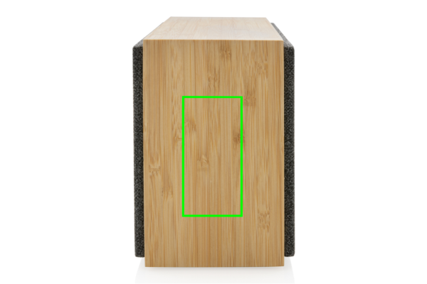 Luxury and powerful 20W speaker with clear sound and strong bass. The outer casing is made from FSC 100% certified bamboo. The plastic components are made with RCS (Recycled Claim Standard) certified recycled ABS. Total recycled content: 17 % based on total item weight. RCS certification ensures a completely certified supply chain of the recycled materials. The speaker comes with BT 5.1 for easy and smooth operation up to 10 metres and low power consumption. The 1200 mah battery allows a playtime up to 6 hours and can be fully re-charged in 3 hours. With pick up function and mic to answer (video) calls. Packed in FSC mix kraft box. Including RCS certified recycled TPE charging cable.
