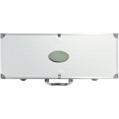 12 tk roostevabast terasest grillikomplekt, sealhulgas 4 tk varrast, nikerdusnuga, 4 maisihoidjat, spaatel, kaitsekattega nikerduskahvel ja tangid. Pakitud hingede ja käepidemega alumiiniumkarpi.