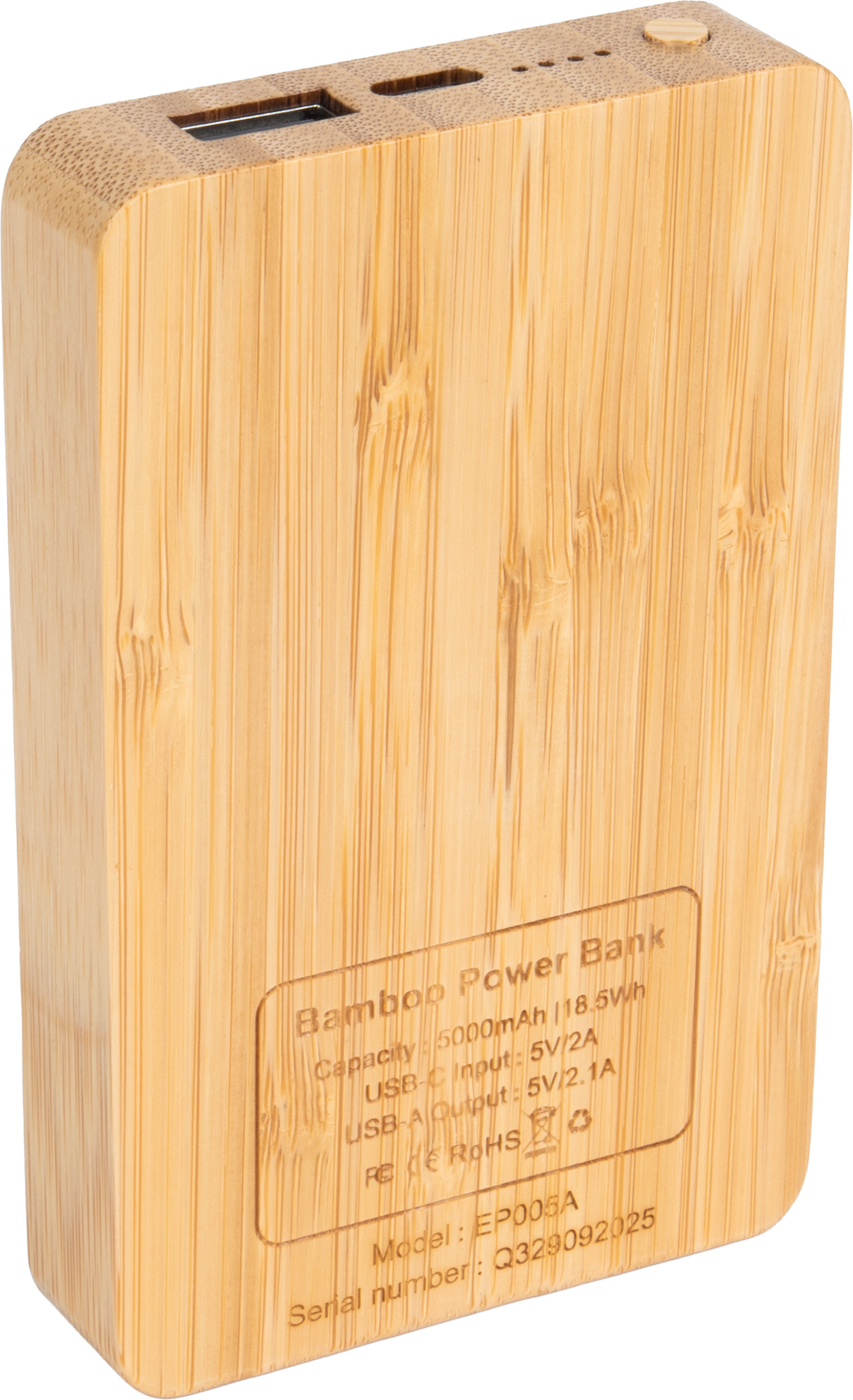 See 5000 mAh bambusest välipatarei ühendab loomuliku esteetika moodsa funktsionaalsusega. Graveeritud logo süttib seadme aktiveerimisel, lisades stiilse ja eristuva visuaalse puudutuse. Neli LED-indikaatorit näitavad aku praegust taset, samas kui USB-C sisend/väljund (5V/2A) ja USB-väljund (5V/2A) tagavad kiire ja usaldusväärse laadimise. Komplektis on USB-C kaabel, mis muudab välipatarei kohe karbist võttes kasutusvalmis.