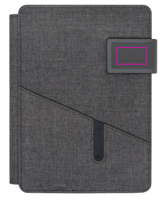 Portfolio Leno A5 koos integreeritud akupangaga (4000 mAh), sülearvutisahti (128 lehekülge) ja taskuga esiküljel. Sisend: 5V/1A - väljund: 5V/2,1A. Trükime teie logo esiküljele.