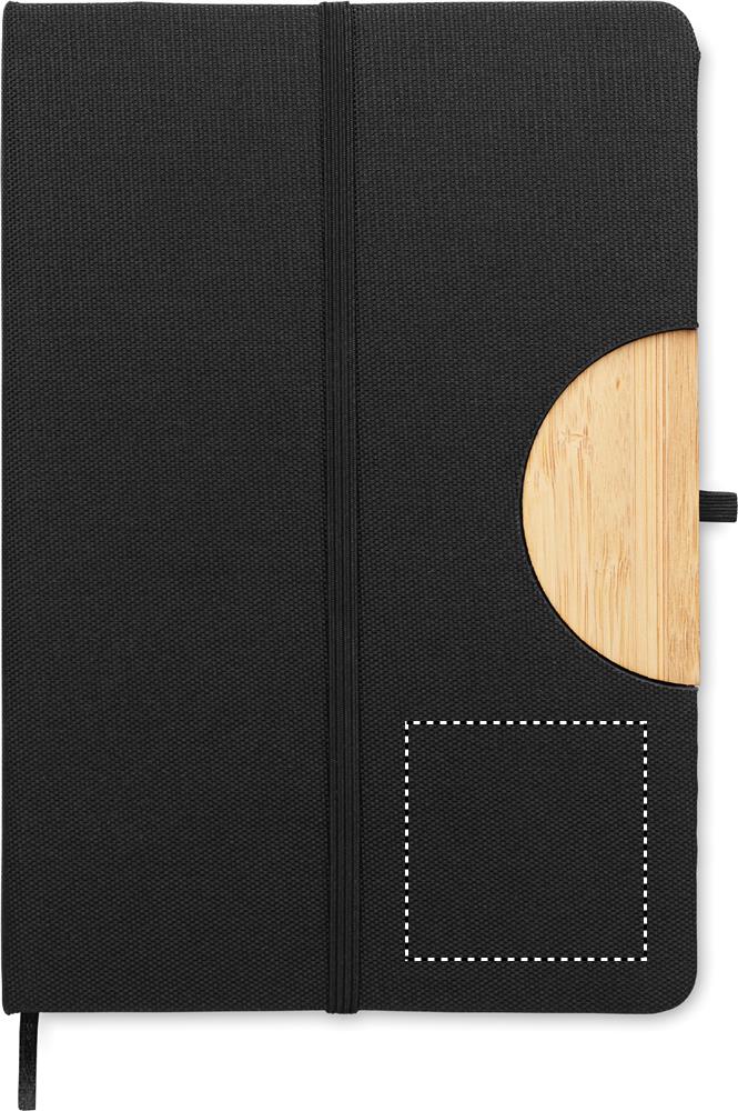A5 sülearvuti 600D RPET kõvakaanega, bambusdetailidega nutitelefoni aluse funktsiooniga. Casebound. 160 joonelist lehte (80 lehte). 70 gsm taaskasutatud paber. Sobiv elastne sulgemisrihm, lindiga lehemarker ja pliiatsihoidja. Bambus on looduslik toode, ühe eseme värvis ja suuruses võib esineda väikesi erinevusi, mis võivad mõjutada lõppviimistlust.