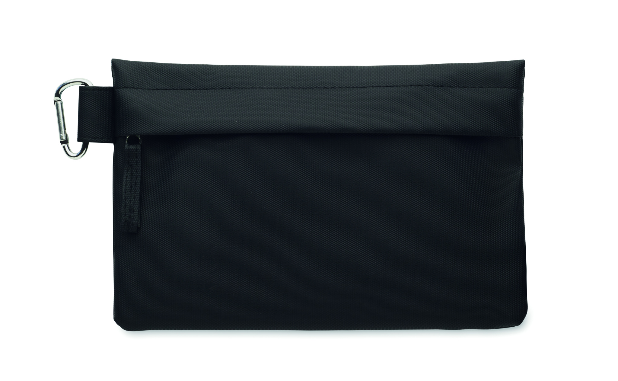 Must lukuga kott PU-kattega 600D RPET polüestrist.