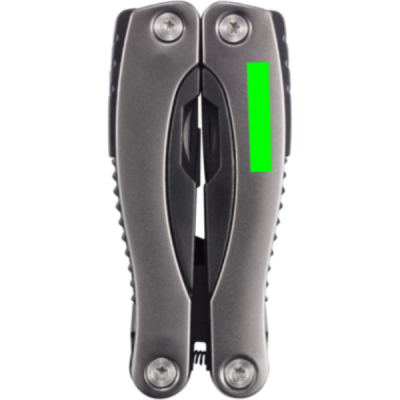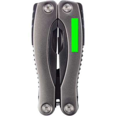 Alumiiniumist multitööriist, mustade detailidega käepide, 14 funktsiooni, pakitud musta 600D kotti.