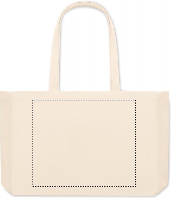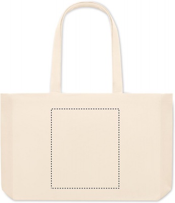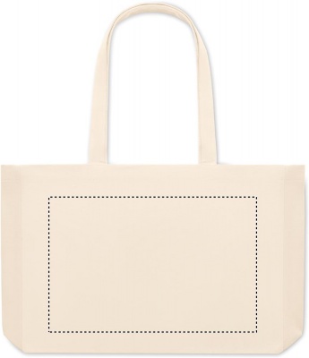 Taaskasutatud lõuendist ostukott või rannakott, 50% puuvill ja 50% taaskasutatud puuvill, pikkade sangade ja servadega. 280 gr/m².