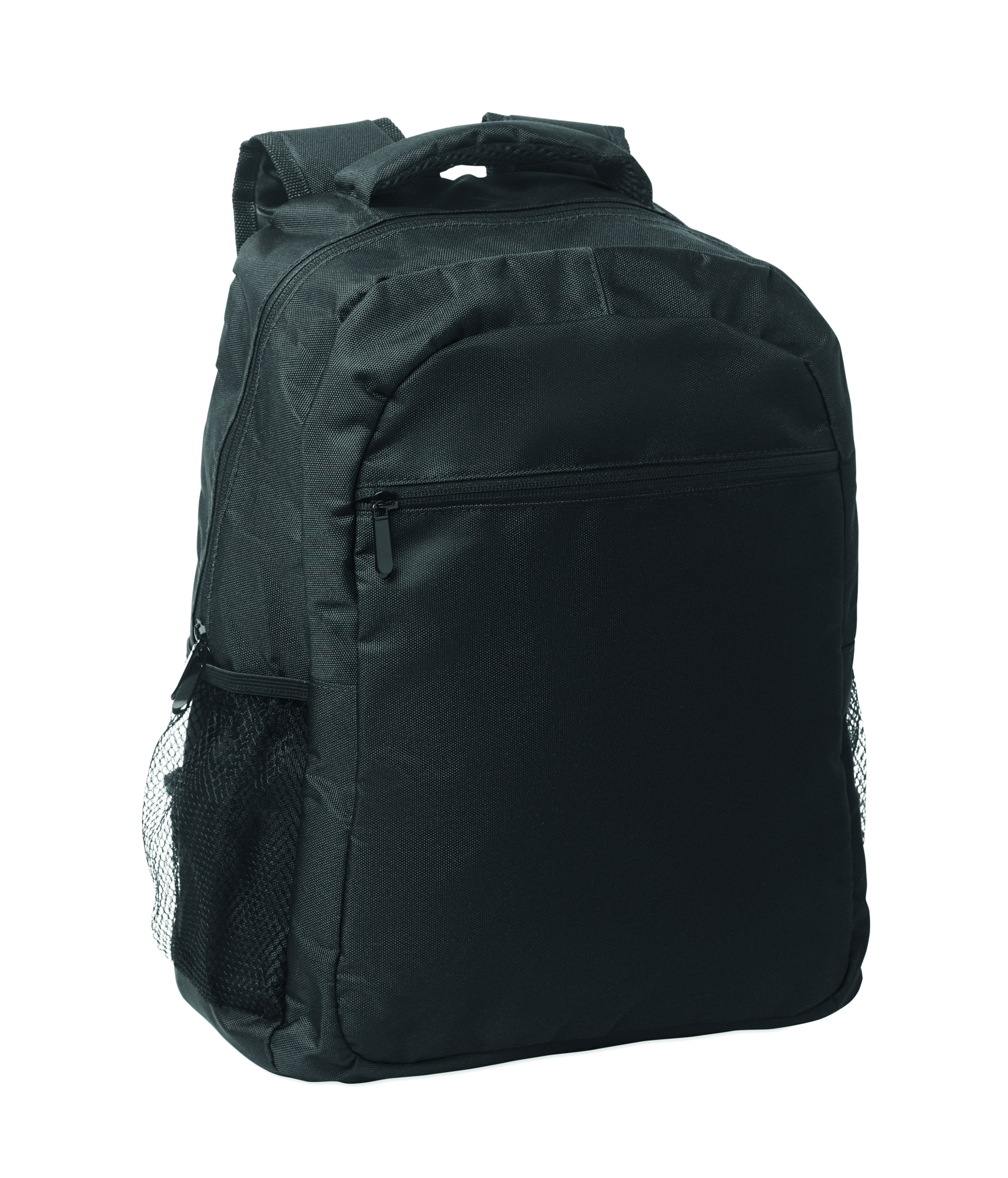 Must 15-tolline sülearvuti seljakott 600D RPET polüestrist, polsterdatud sülearvuti sahtel sees, võrktaskud mõlemal küljel ja lukuga esitasku.