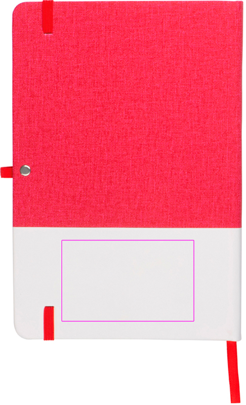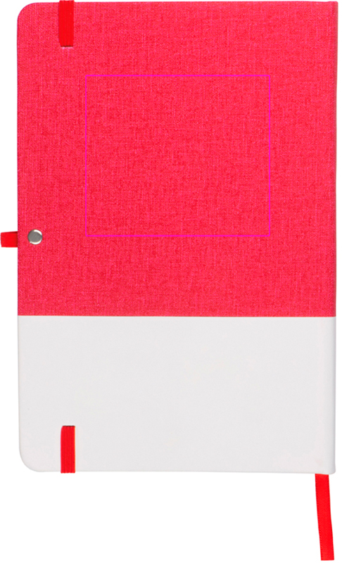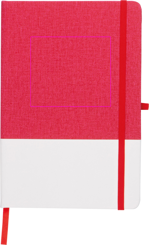 A5-muistivihko 160 neliösivulla, PU-kangaskansi, kirjanmerkki, kuulakynälenkki ja joustava kuminauha. Painamme logosi valkoiselle pinnalle.