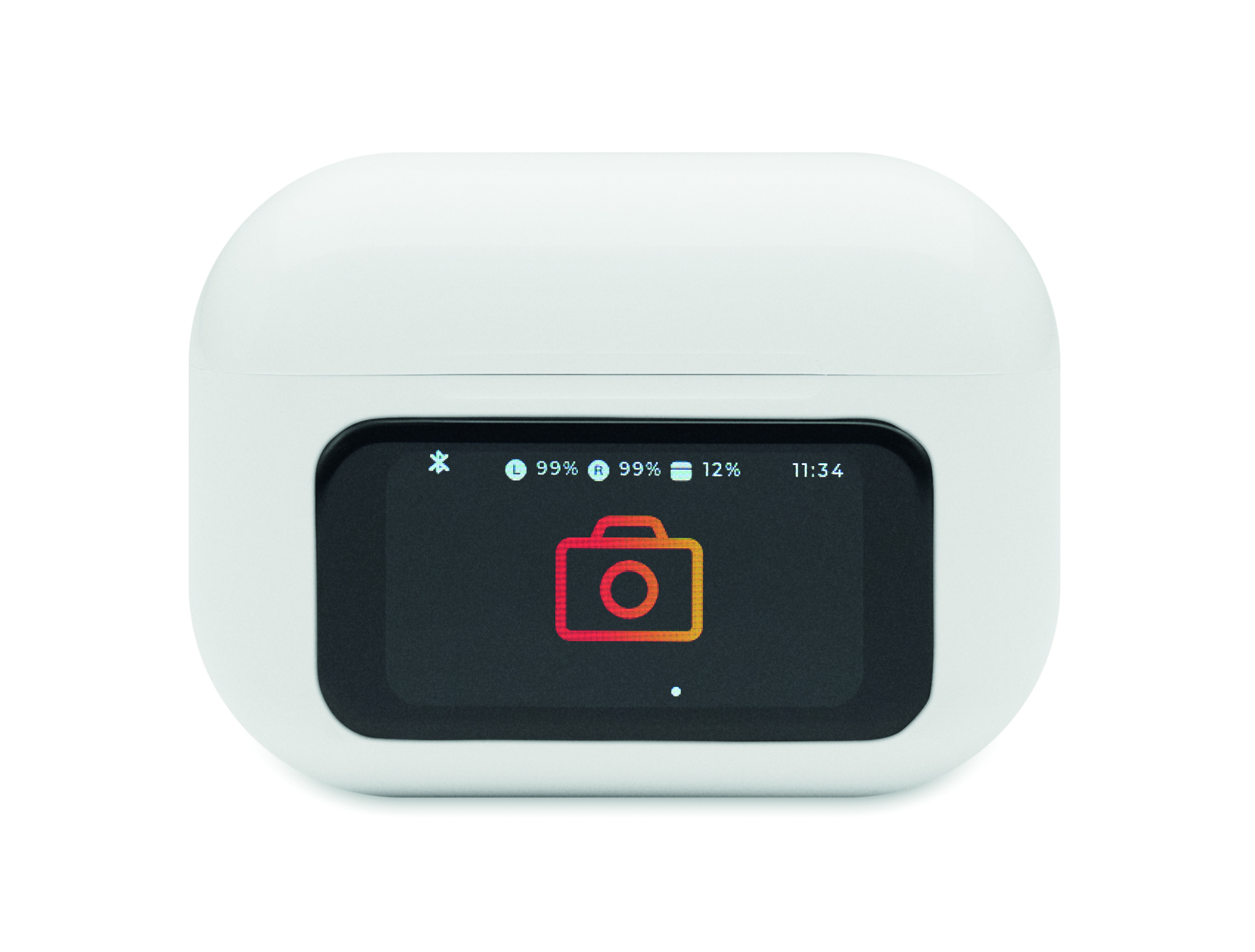 Kierrätetystä ABS-muovista valmistetut langattomat True Wireless Stereo (TWS) 5.0 -stereonappikuulokkeet (30 mAh), joissa ANC/ENC ja mikrofoni sekä 230 mAh:n latausalusta. Kosketusnäyttö.