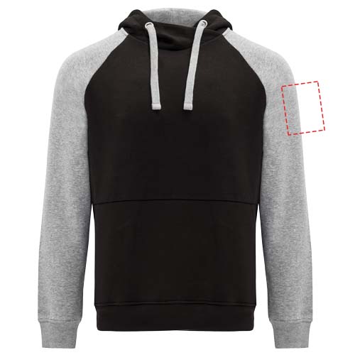 Kaksivärinen unisex-huppari. Hupussa ristikkäinen pääntie ja metallilenkit. Kontrastivärinen hupun sisäosa, kiristysnyöri ja raglan-hihat. Kengurutasku. Hihansuut ja helma 1x1-elastaanijoustinneuletta. Irrotettava etiketti.
