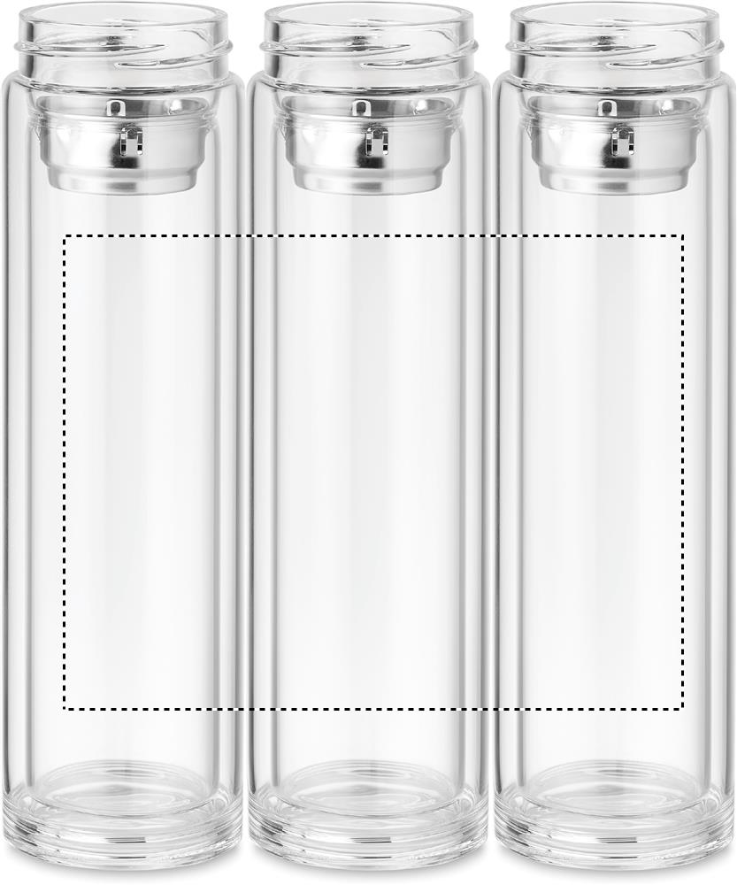 Kaksiseinäinen 390ml borosilikaattilasipullo, korkissa LED- kosketusnäyttö lämpömittari ja -sisällä irroitettava teesiivilä. Sisältää CR2032 patterin, tuote on vuoto vapaa. Borosilikaattilasiin ei voi kaiverruttaa.
