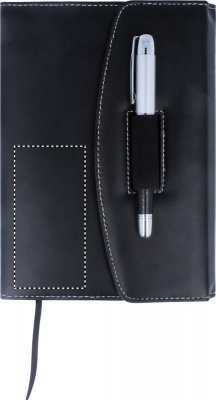 A5 PU kansio kontrastitikkauksella, sisältää 120 sivua viivattua paperia ja metallikynän mustalla musteella.