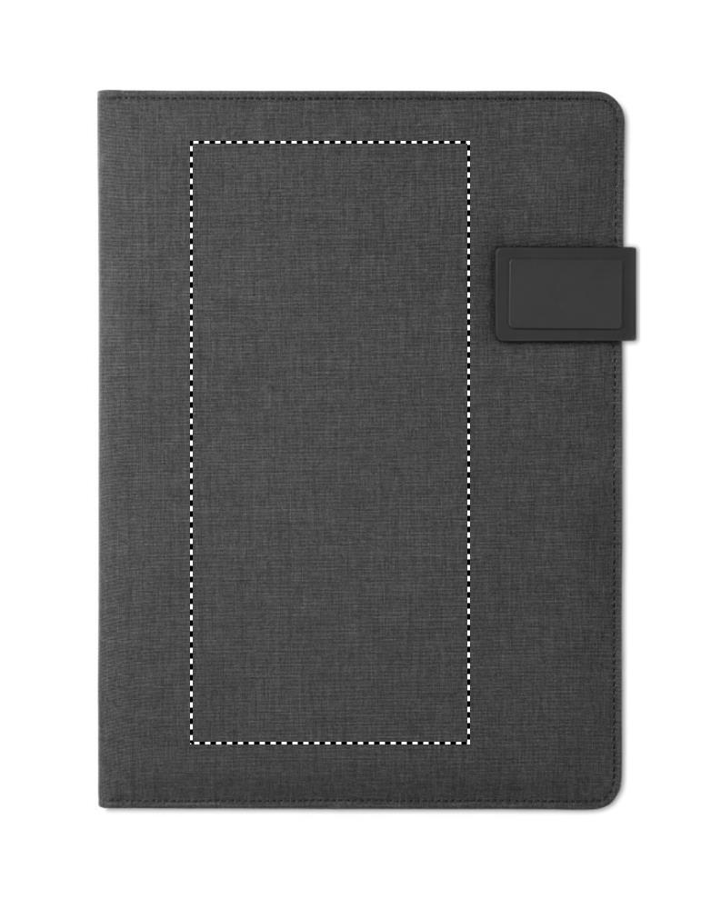Pellava/PU A4 kokouskansio, jossa magneettisuljin. Sisäänrakennettu varavirtalähde 4000 mAh:n kapasiteetilla, joka riittää älypuhelimen lataamiseen 1-2 kertaa mallista riippuen. Sisäänrakennettu mikro-USB C- tyypin liitin. Sisältää matkapuhelintelineen, 20-sivuisen lehtiön ja useita pieniä taskuja helppoa säilytystä varten.
