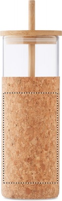 Borosilikaattilasinen juomapullo, jossa korkkisuojahylsy ja bambukansi sekä pillit. Tilavuus 450 ml. Koska kyseessä on yksiseinäinen pullo, lämmön siirtymistä voi silti tapahtua.