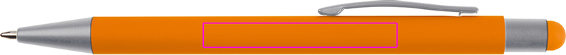 Metallinen kuulakärkikynä kumipinnoitteella, kosketuskynä ja sininen kirjoitus suurikapasiteettinen täyttö. Laserimme logosi leikkeen oikealle puolelle.
