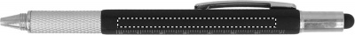 ABS-monitoimikynä mustalla musteella, kiertomekanismilla, viivoittimella ja kosketusnäyttöpäällä. Ristipää ja talttaruuvimeisseli.