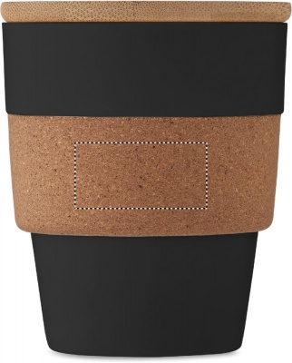 Yksiseinäinen muki kierrätetystä PP:stä, jossa korkkisuojus ja bambukansi. Tilavuus: 300 ml. Koska kyseessä on yksiseinäinen muki, lämmönsiirtymistä voi silti tapahtua.