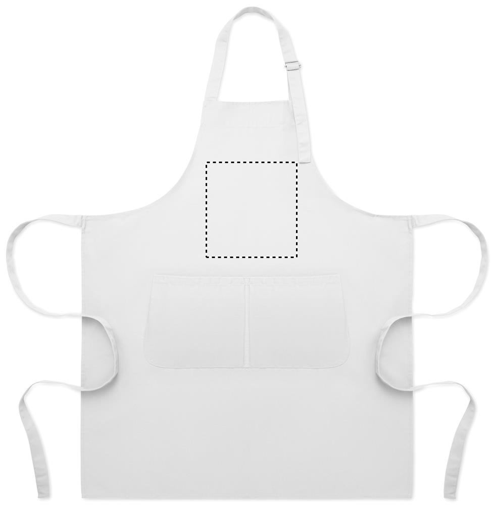 Pitkä, säädettävä keittiöesiliina 240 g/m² polypuuvillaa (35 % puuvillaa, 65 % polyesteriä), jossa kaksi etutaskua ja säädettävä hihna metallisoljella.