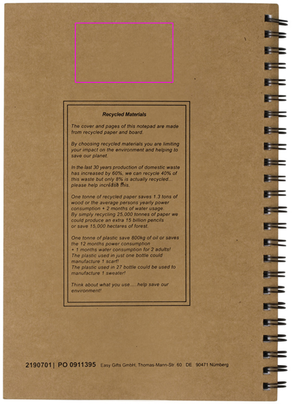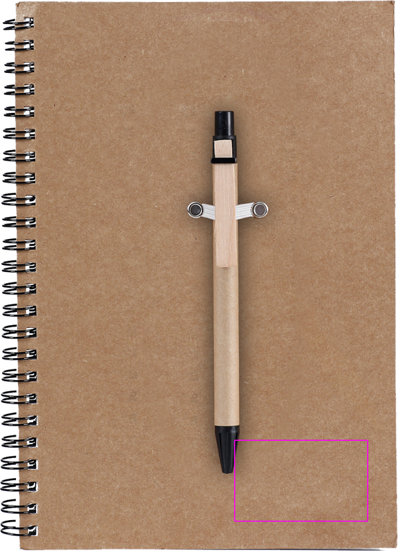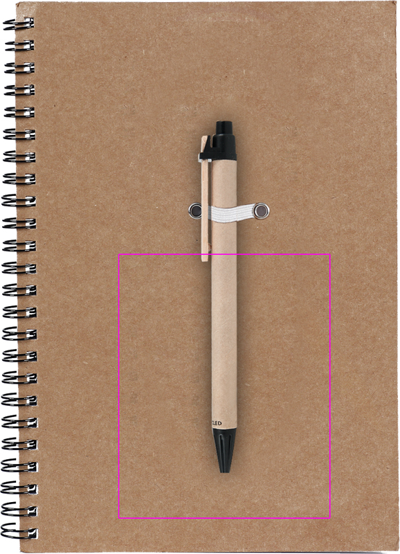 A5 formāta rakstāmbloks izgatavots no pārstrādāta kartona un papīra ar 120 rindu lapām un zilas tintes lodīšu pildspalvu, kas izgatavota no pārstrādāta kartona. Mēs uzdrukājam jūsu logotipu uz vāka.