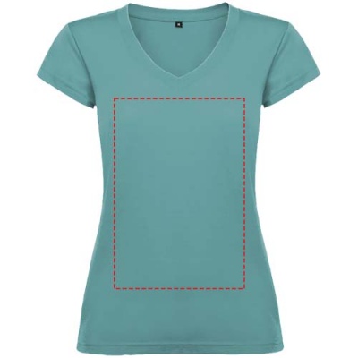 Sieviešu t-krekls ar īsām piedurknēm V veida kakla izgriezumā ar 1x1 rievotu apdari. Pieguļošs ar sānu vīlēm. Noņemama etiķete. Modelis ir 174 cm garš un valkā S izmēru.