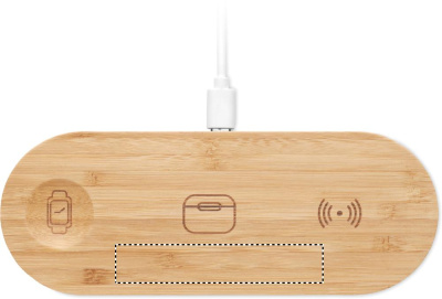 3 in 1 charging station in bamboo case. It includes a wireless charger 15W, smartwatch charger (Apple® only) and TWS charger.