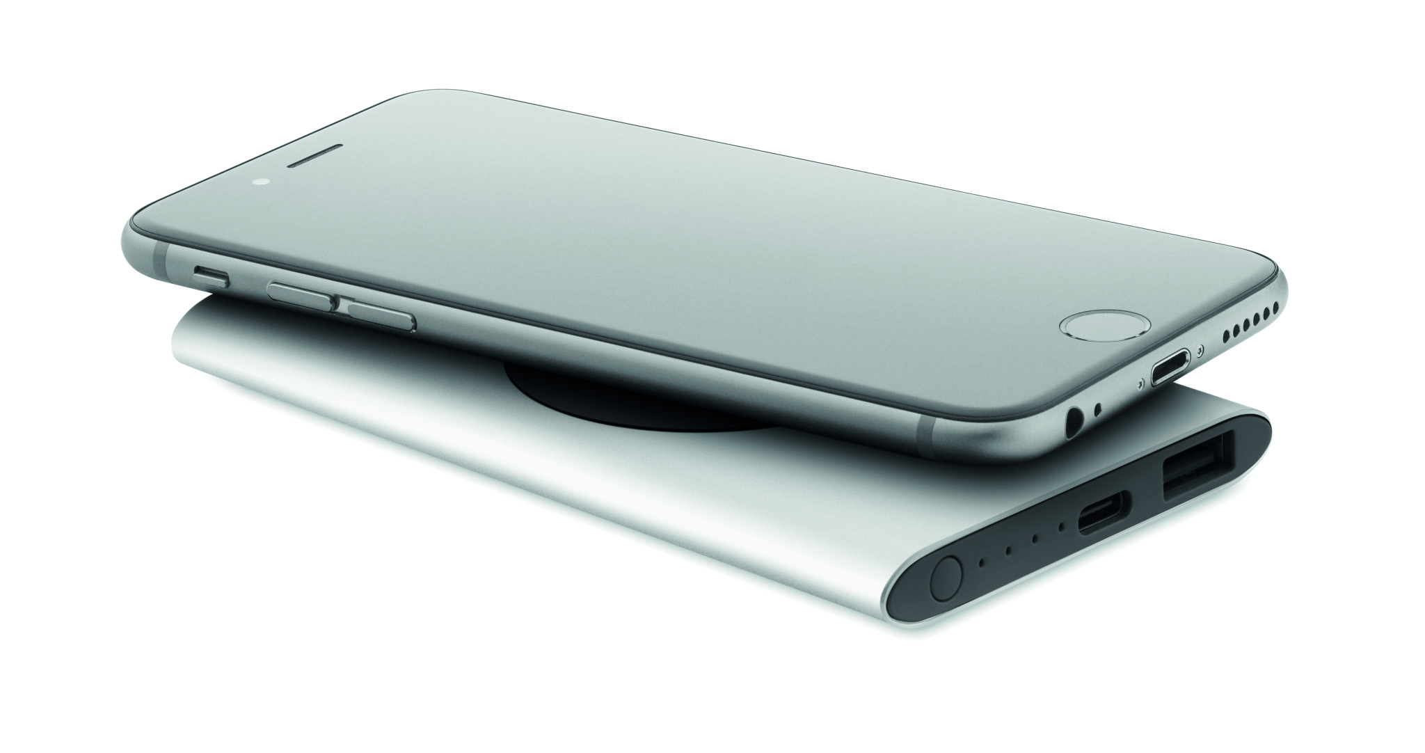 Беспроводной аккумулятор 5000 мАч с зарядкой 15 Вт из переработанного алюминия. Вход: Type-C. Выход: 1 x Type-C & 1 x Type-A. Выдаваемый ток DC5V/2A. Совместимость с последними моделями андроидов, iPhone® 8, 8S и X и более новыми.