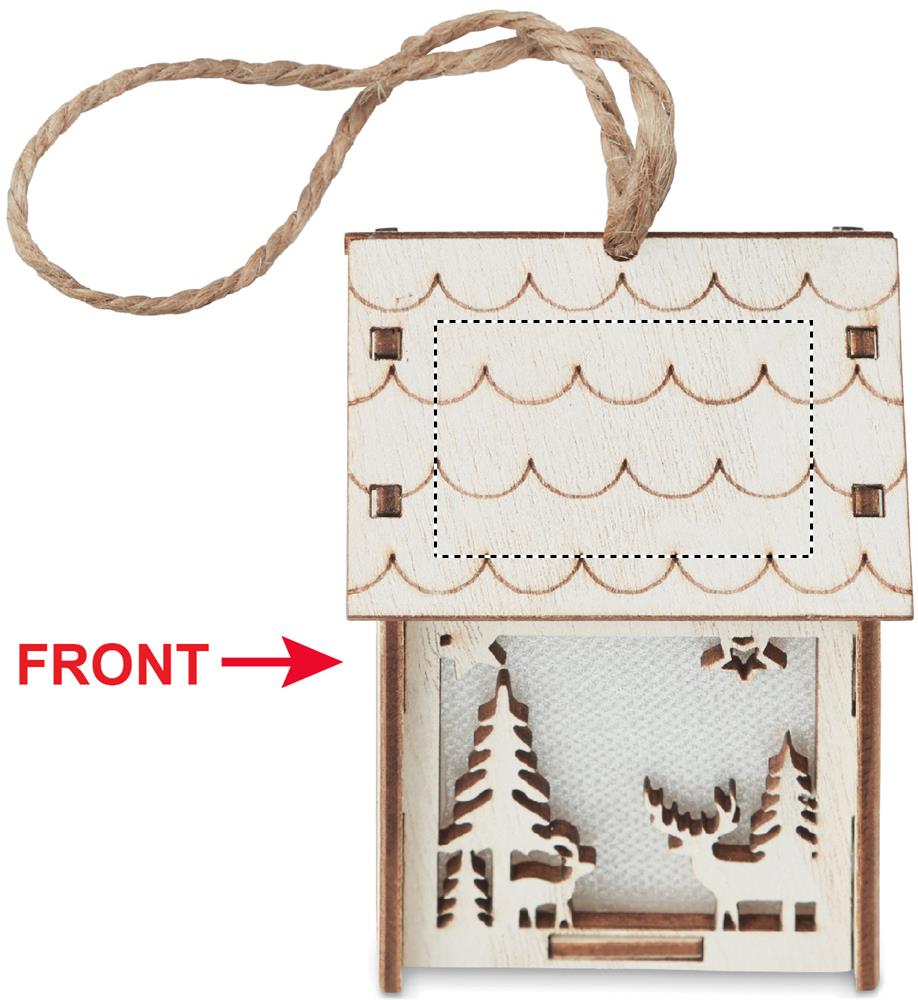 Декоративный домик из МДФ с внутренней подсветкой с рождественским орнаментом и подвеской. 3 батарейки AG10 в комплекте.