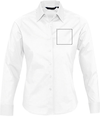 SOL'S EDEN women shirt 140g. Эта выполненная из хлопка с добавлением эластана рубашка приталенного покроя хорошо держит форму и комфортно носится. Очень актуальная модель. Приталенная модель. Длинный рукав. Воротник на одной пуговице. Регулируемые манжеты на 2 пуговицах и разрез рукава ''капуцин''. Планка с 7 пуговицами в цвет изделия. Вытачки спереди и на спине. Fabric details: Поплин 97% хлопок - 3% эластан. OEKO-TEX. Only Sold with Print.