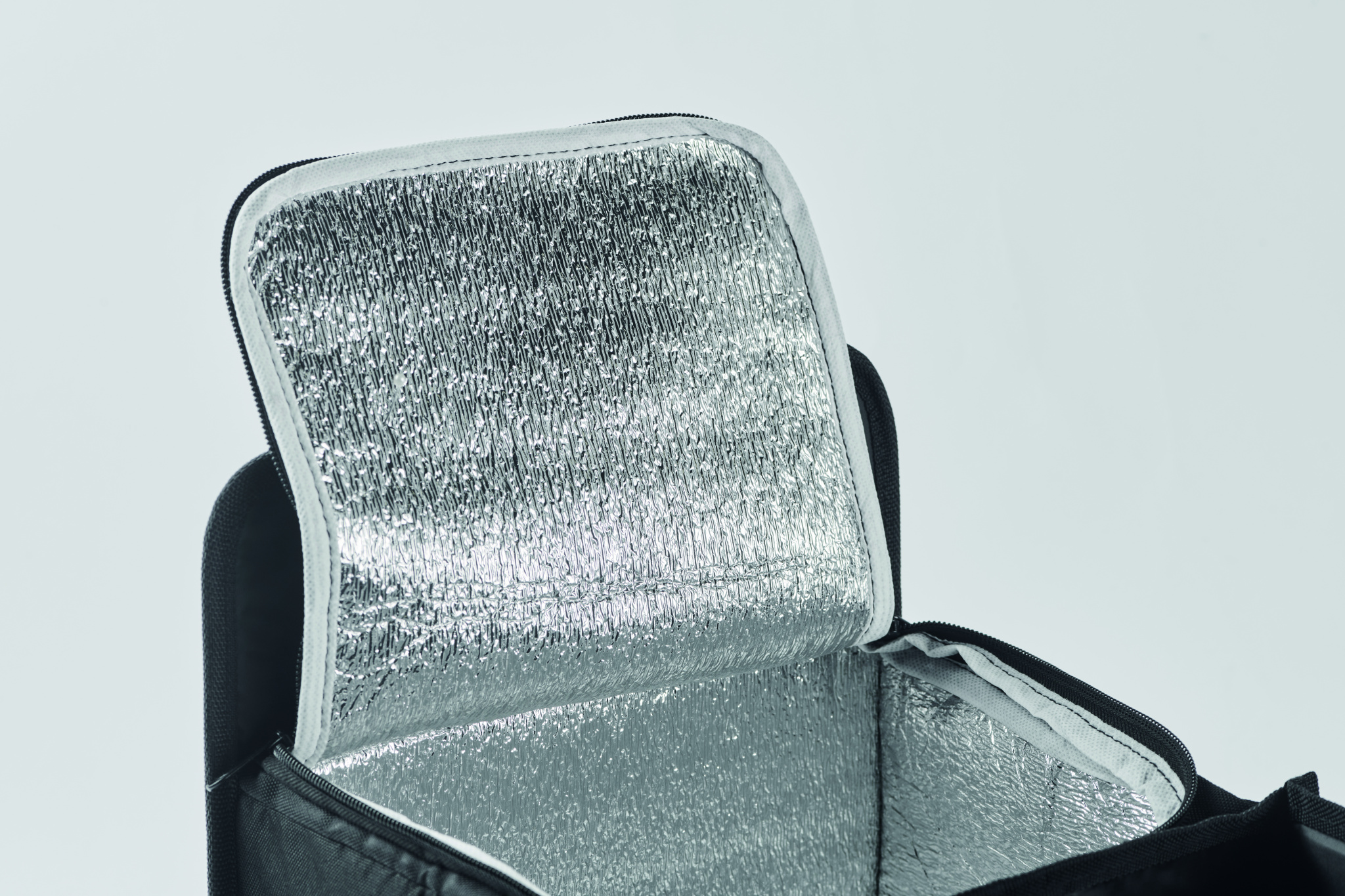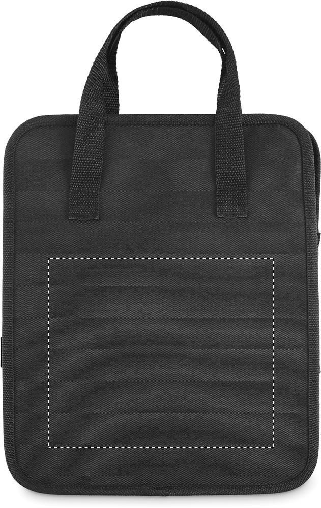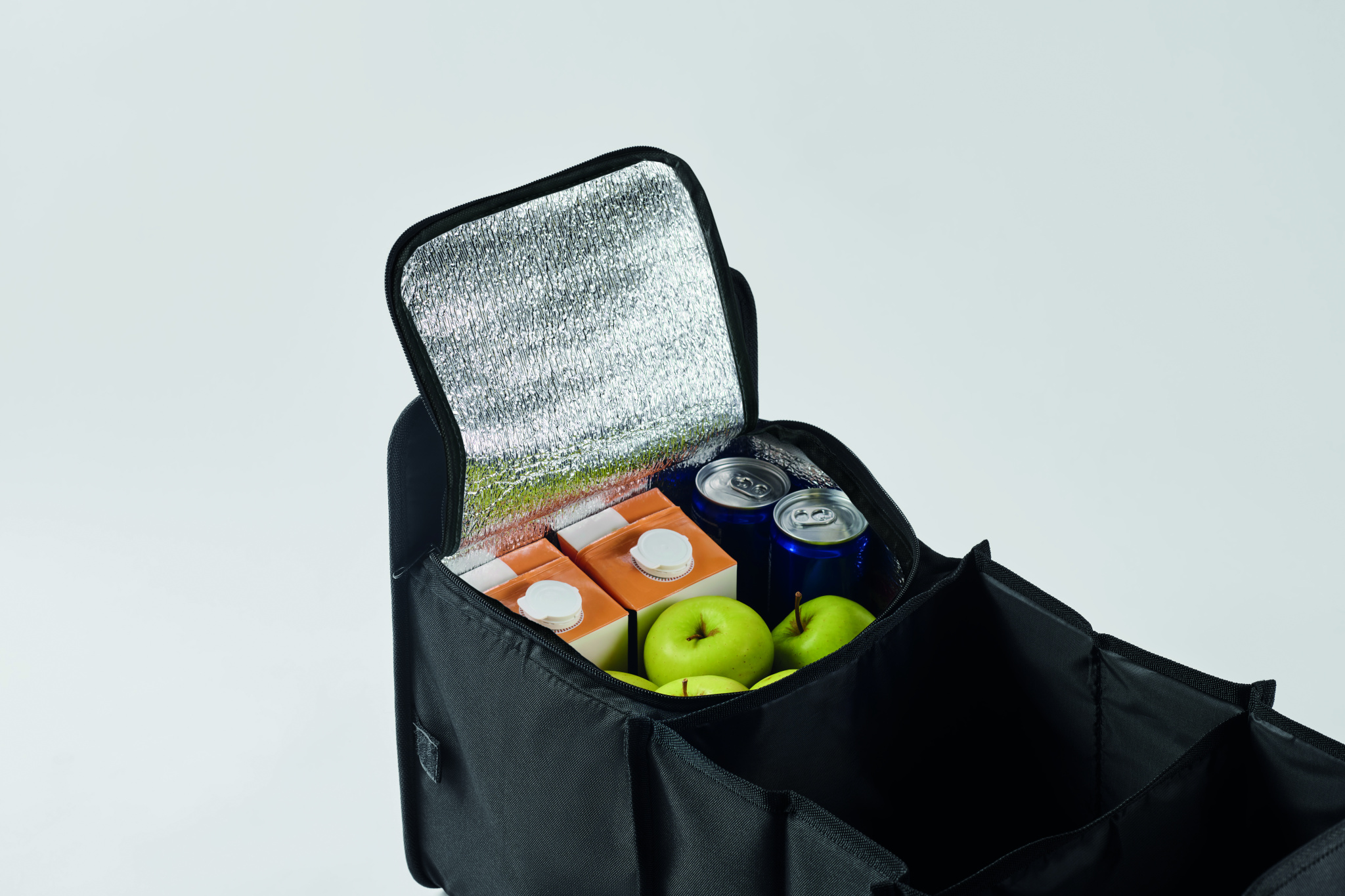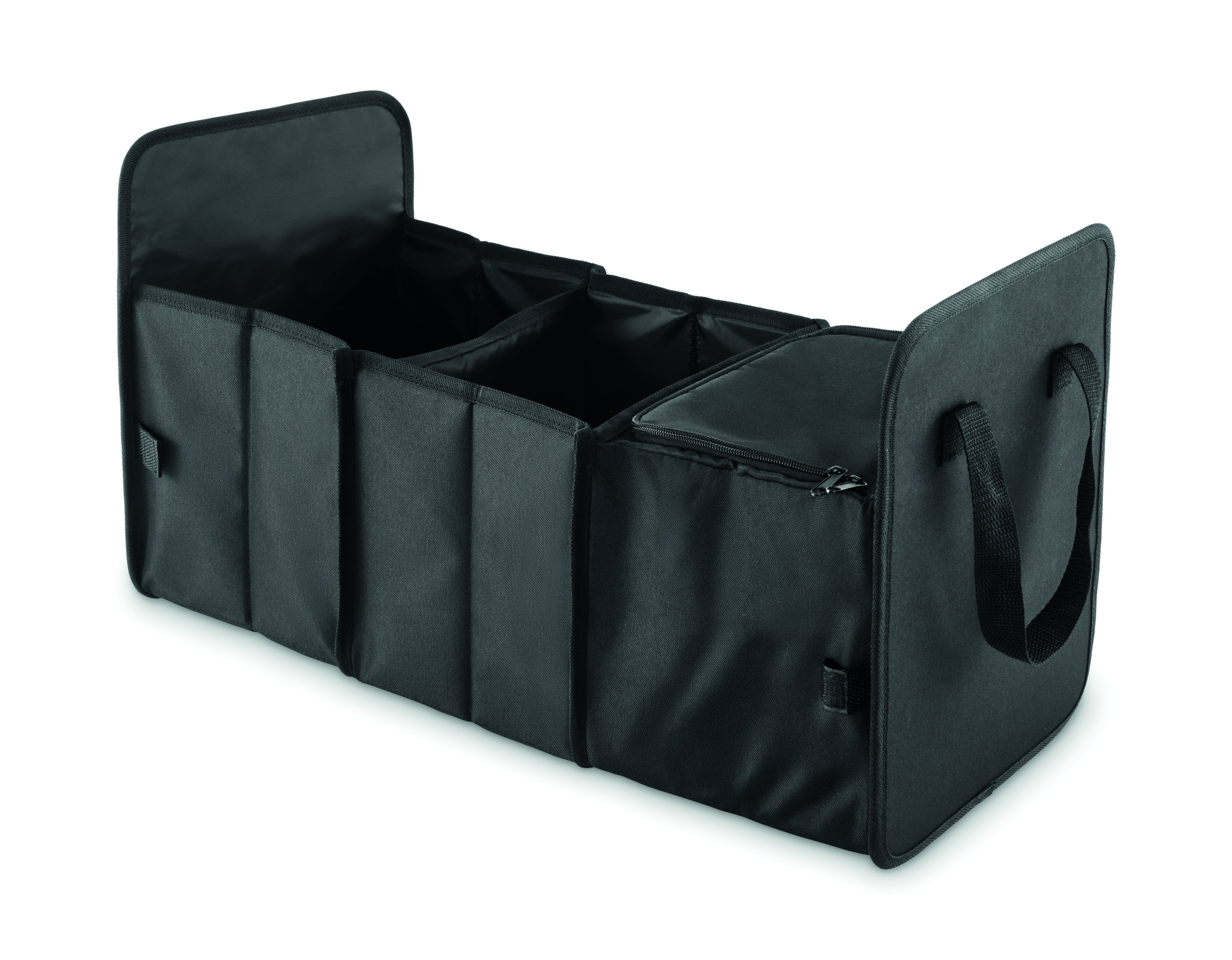 Foldable car organizer in 600D RPET polyester with 3 compartments of which one cooler compartment.