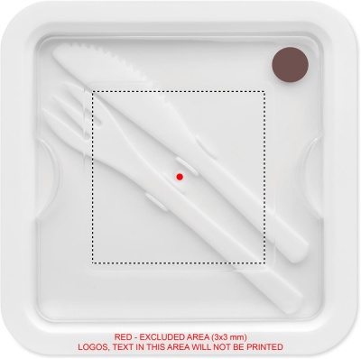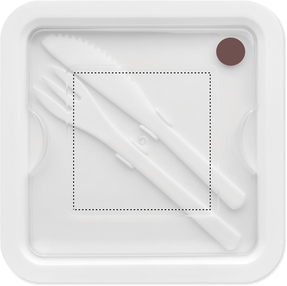 Пластиковый ланч бокс с 2 отделениями. В крышке находится набор столовых приборов из полипропилена. Емкость: 600 мл.