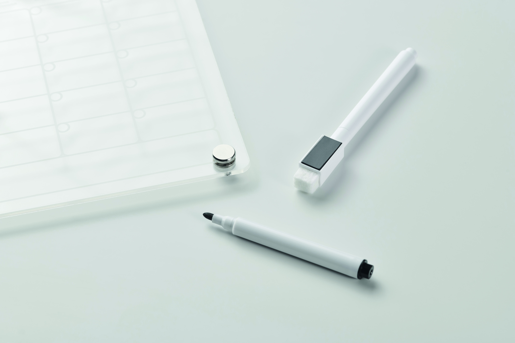 Magnetic acrylic monthly planner in A4 size with 3 erasable magnetic markers (black, red and white). Includes screws for mounting.