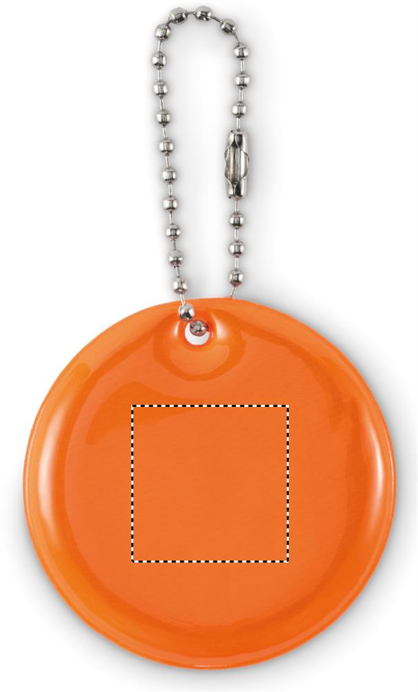 Round reflective keyring in PVC. For promotional use.