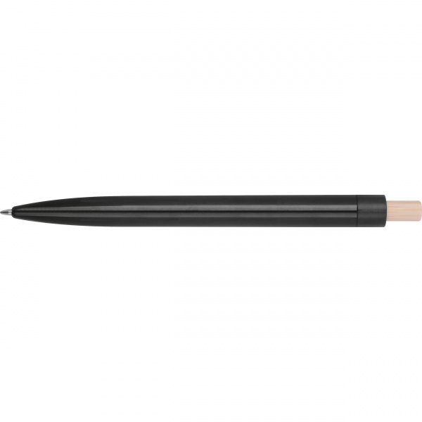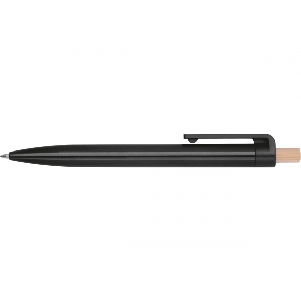 Шариковая ручка из переработанного АБС-пластика с бамбуковой кнопкой. Стержень из пластика синего цвета. Ваш логотип напечатан на корпусе под зажимом.